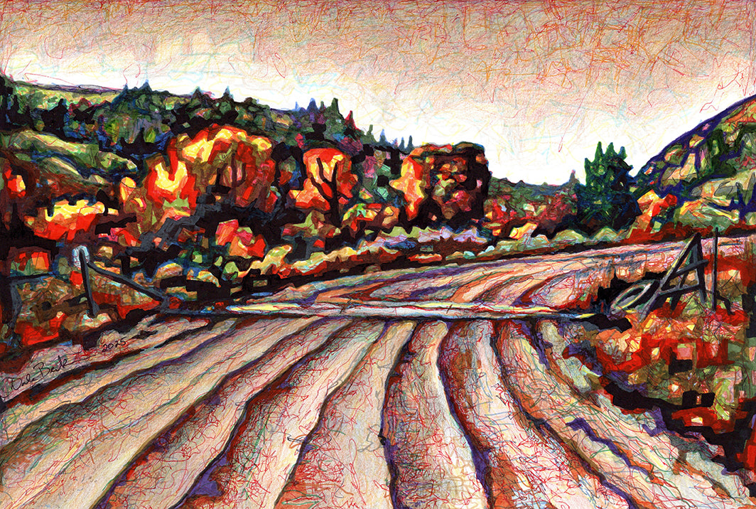 An evocative ink and pastel rendering of the Badlands stretches into the horizon, where vast, untamed expanses command the viewer’s gaze, embodying the spirit of isolation and raw beauty. Deep, shifting shadows spill from rugged hills and tangled vegetation, accentuating the land’s stark contrasts—its luminous highlights and dusky hollows whispering a story of timeless wilderness and quiet mystery.